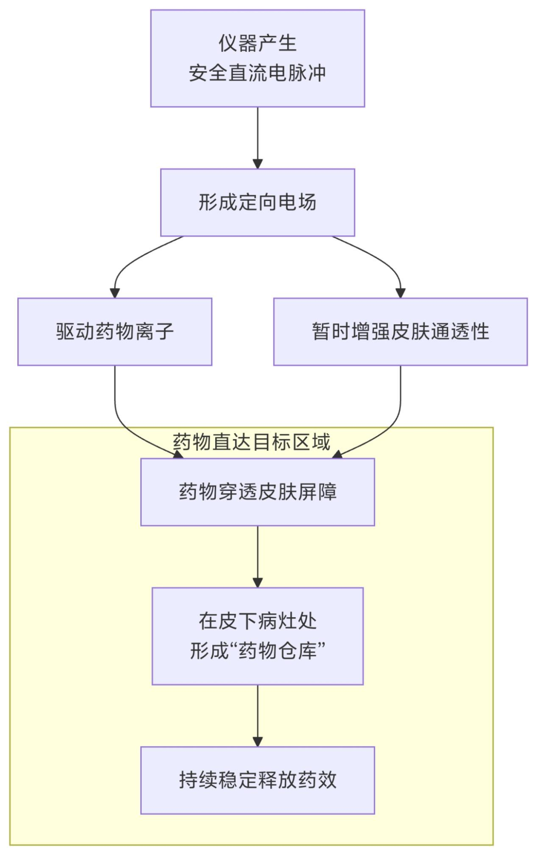 无创药物导入仪的核心原理,是利用安全、低强度的直流电脉冲,创造出一种物理动力,将事先涂抹在皮肤上的特定药物离子(或分子)“推”过皮肤屏障,精准地送达皮下的病灶区域。