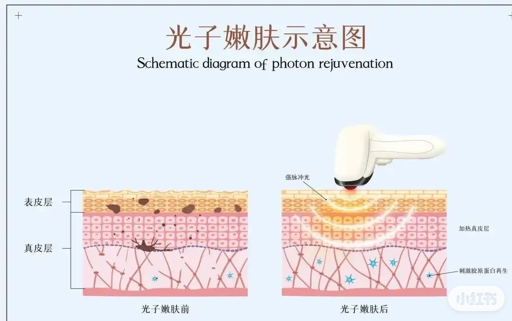 针对“黑”(色素沉着):光能被黑色素吸收,像微型炸弹一样将色素团块击碎,随后由人体代谢排出,从而淡化晒斑、痘印,整体提亮肤色。