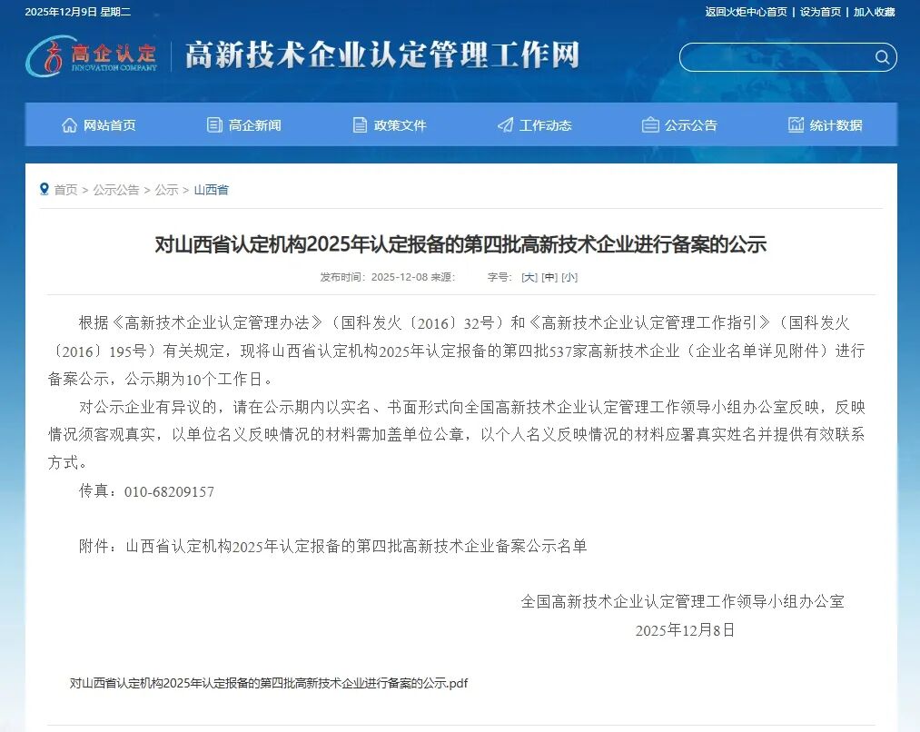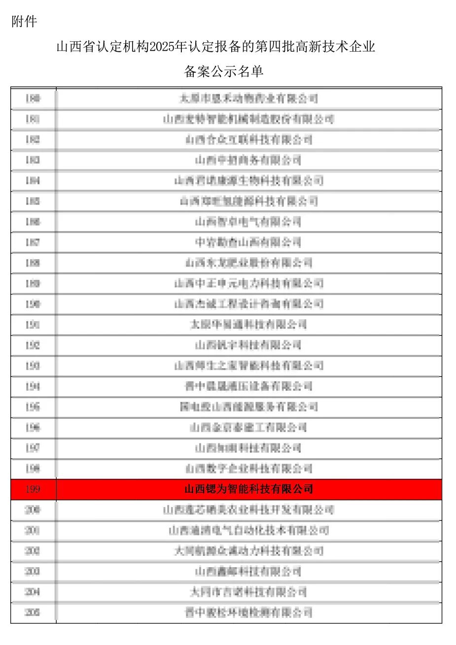 2025年12月8日,根据《高新技术企业认定管理办法》(国科发火(2016)32号)和《高新技术企业认定管理工作指引》(国科发火(2016)195号)有关规定,山西省科技厅对2025年认定的高新技术企业进行了备案公示。山西锶为智能科技有限公司(以下简称“锶为智造”)顺利通过第二次国家级高新技术企业认证。