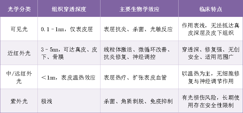 近红外光凭借深层穿透性、高生物安全性、全面修复效应与神经调节能力,在光学治疗体系中占据核心地位。与可见光、中远红外光、紫外光相比,其作用深度更深、靶点更精准、适应症更广泛。