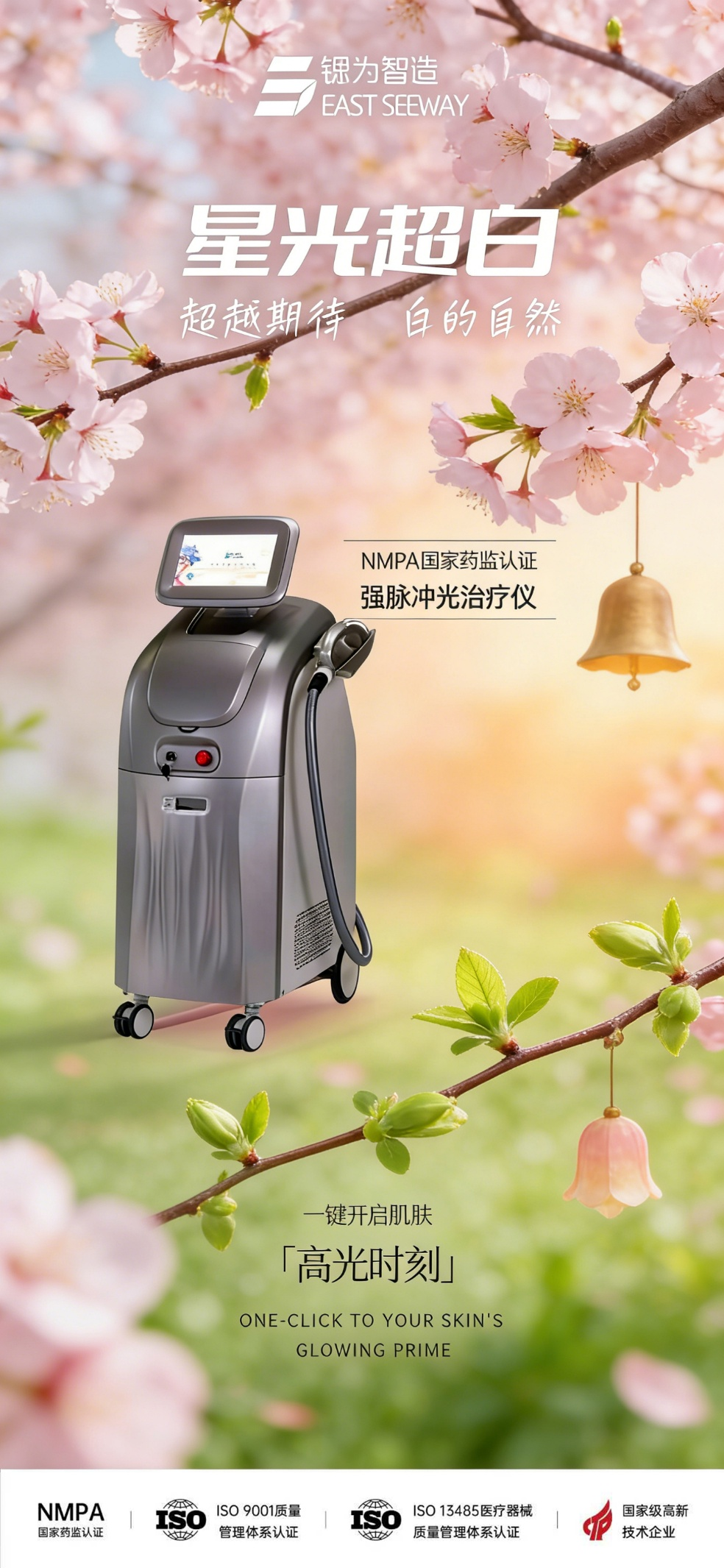 “星光超白”是一种基于强脉冲光技术的光子嫩肤设备,通过特定波段的光能量精准作用于皮肤。它能有效改善肤色暗沉、淡化色斑、缩小毛孔、减少红血丝,同时刺激胶原再生,让肌肤更加细腻透亮。